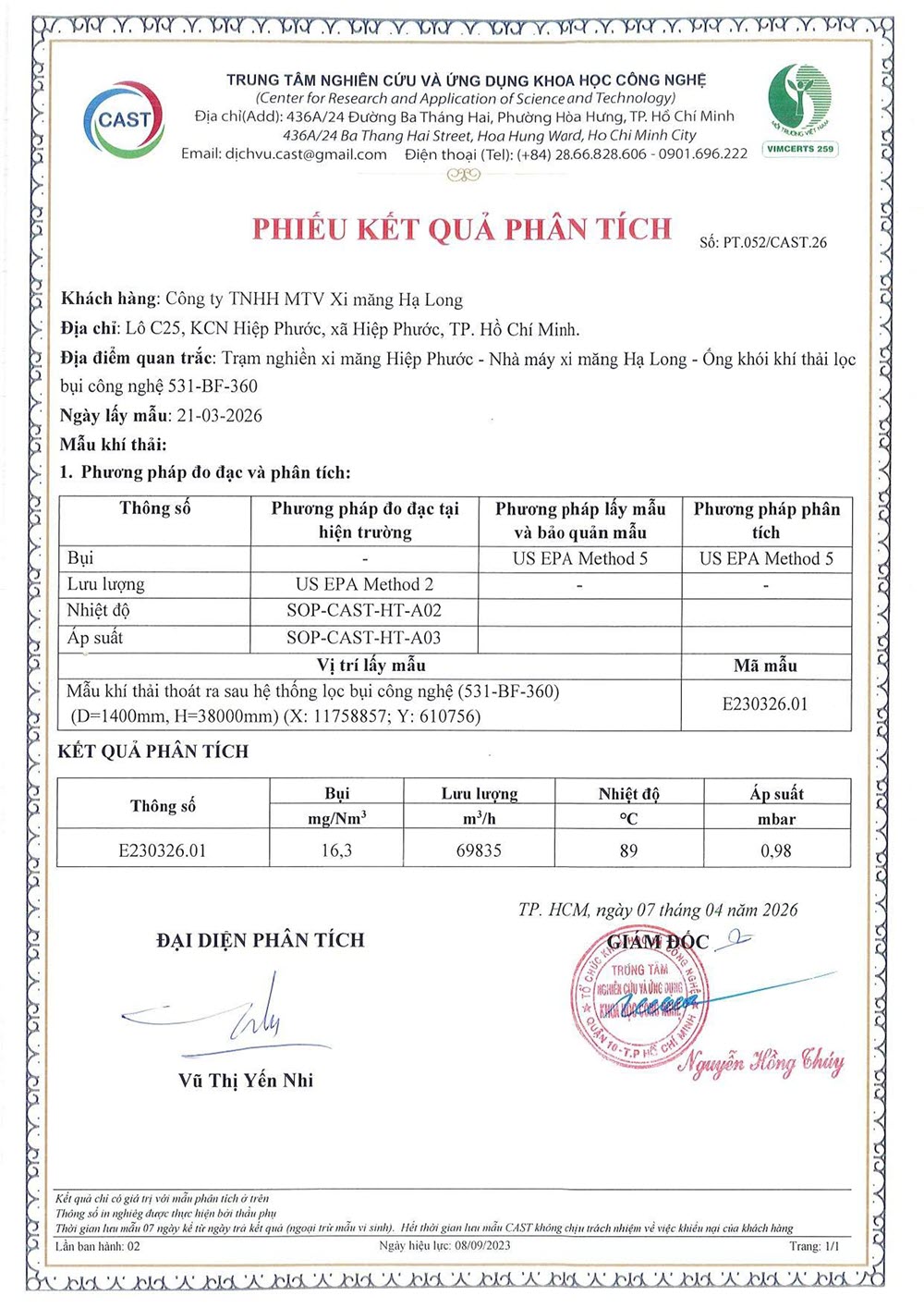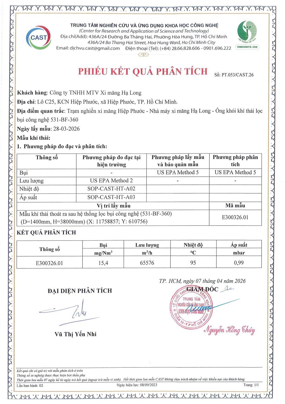 Kết quả quan trắc ngày 21.03.2026 và 28.03.2026 tại ống khói máy nghiền xi măng 531.BF.360
