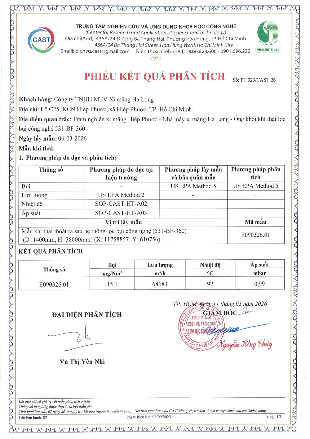 Kết quả quan trắc ngày 06.03.2026 tại ống khói máy nghiền xi măng 531.BF.360