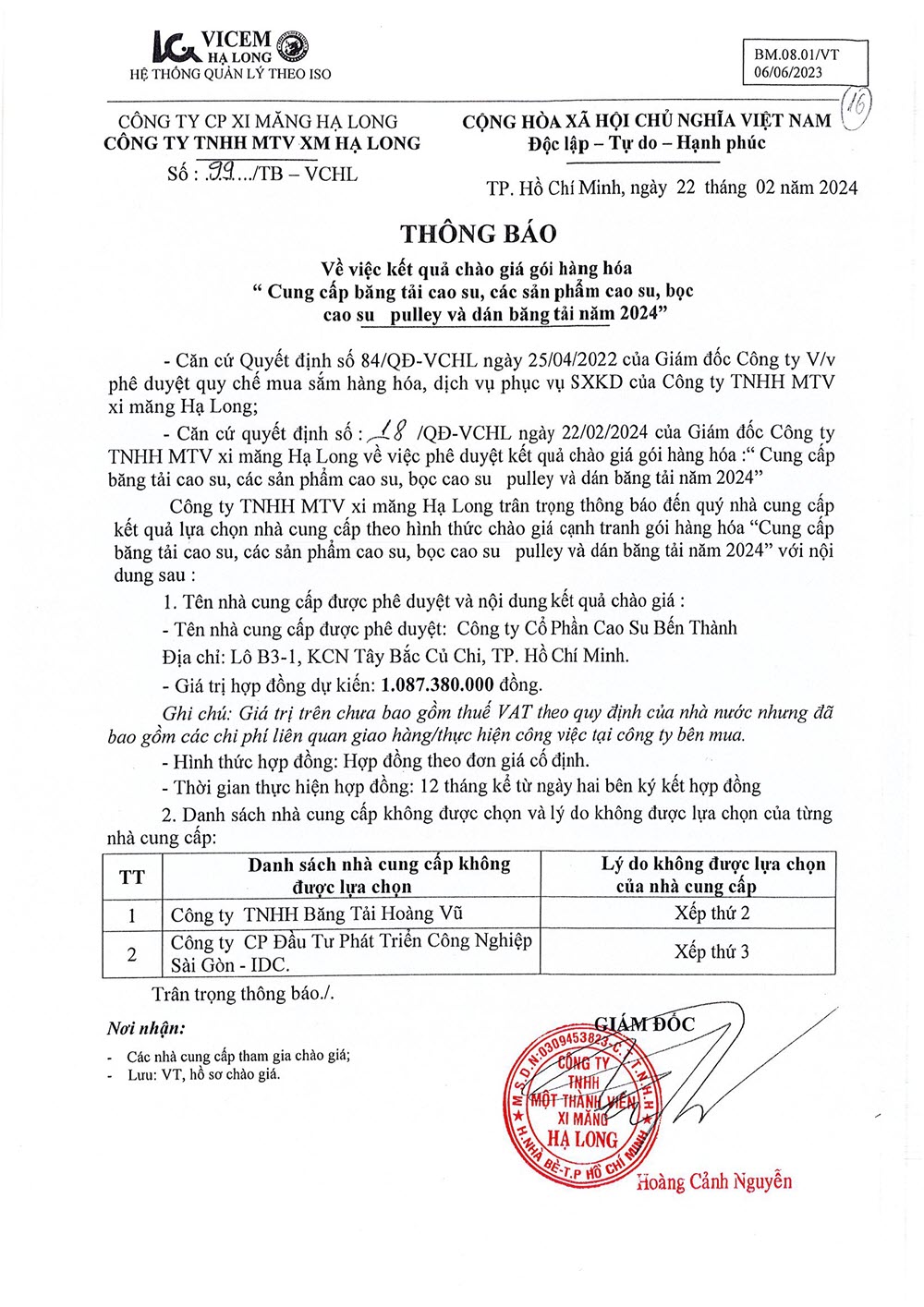 Thông báo kết quả chào giá cạnh tranh gói hàng hóa “Cung cấp băng tải cao su, các sản phẩm cao su, bọc cao su pulley và dán băng tải năm 2024”
