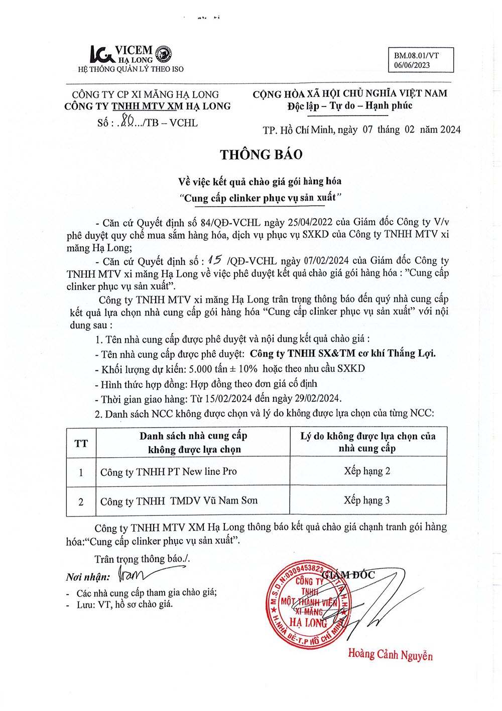 Thông báo kết quả chào giá cạnh tranh gói hàng hóa “Cung cấp Clinker phục vụ sản xuất”
