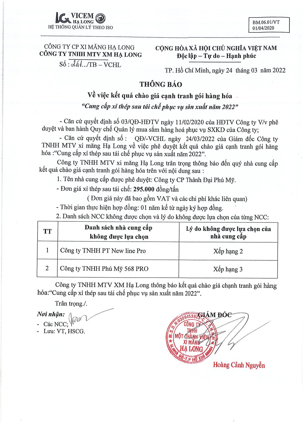Thông báo kết quả chào giá cạnh tranh gói hàng hóa “Cung cấp xỉ thép sau tái chế phục vụ sản xuất năm 2022”