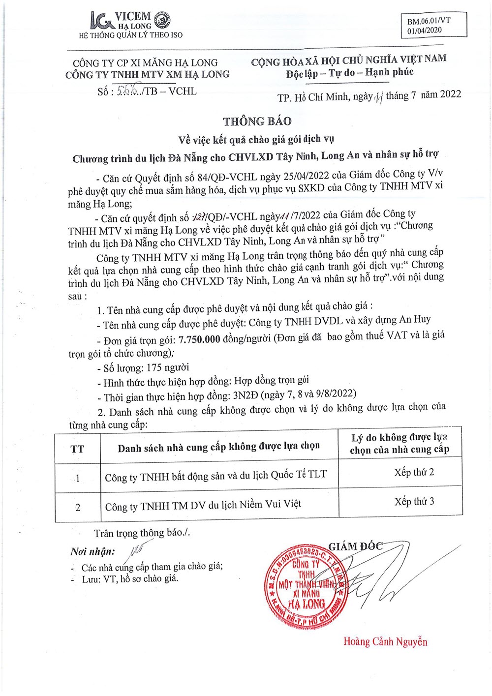 Thông báo kết quả chào giá gói dịch vụ “Chương trình du lịch Đà Nẵng cho CHVLXD Tây Ninh, Long An và nhân sự hỗ trợ”