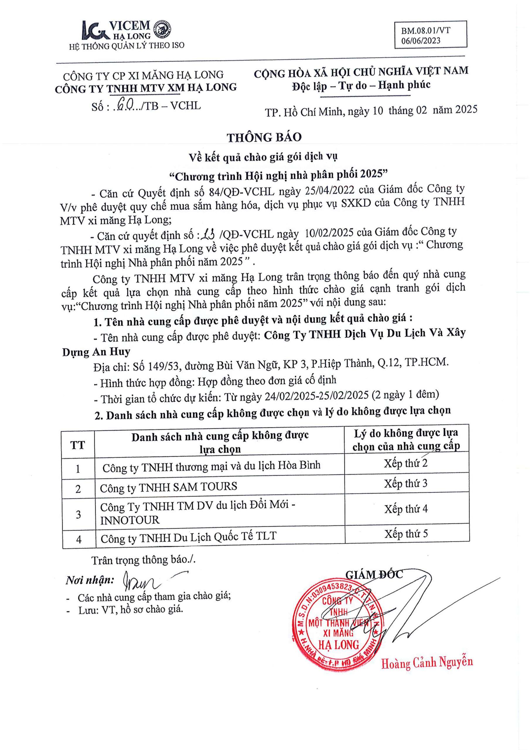 Thông báo kết quả chào giá gói dịch vụ “Chương trình hội nghị nhà phân phối 2025”