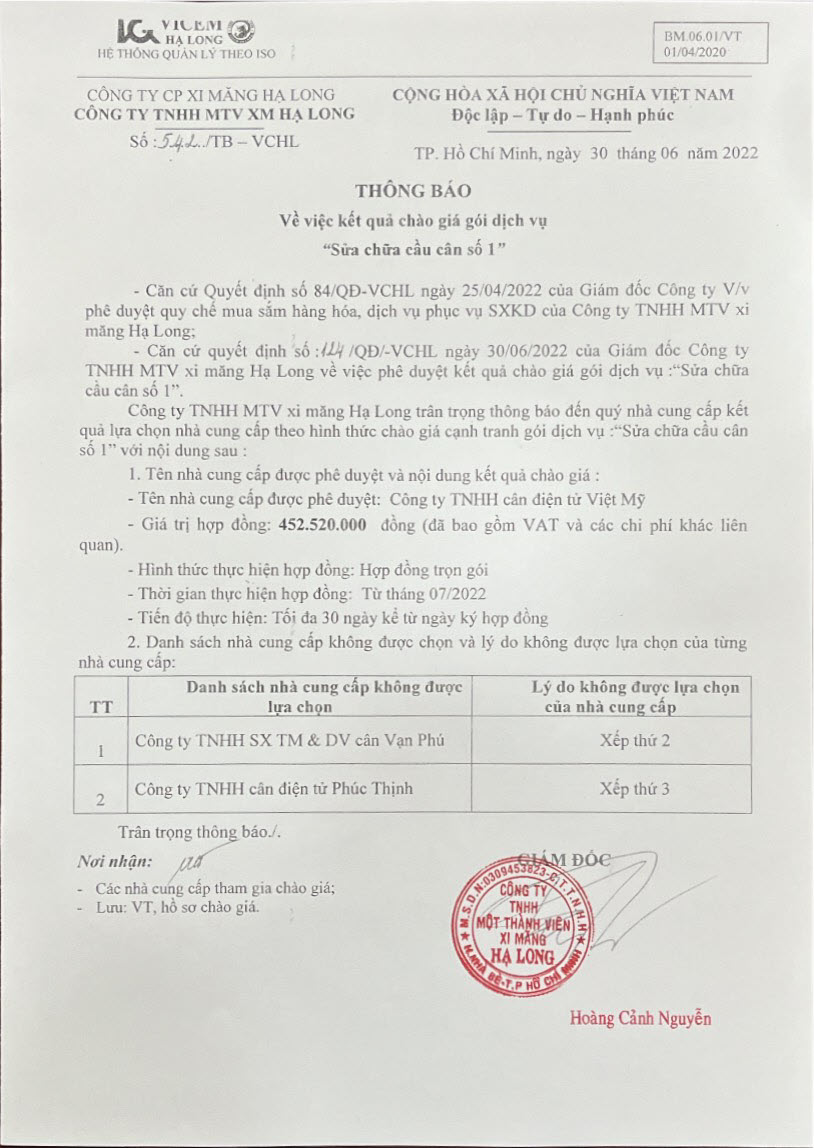 Thông báo kết quả chào giá gói dịch vụ “Sửa chữa cầu cân số 1”