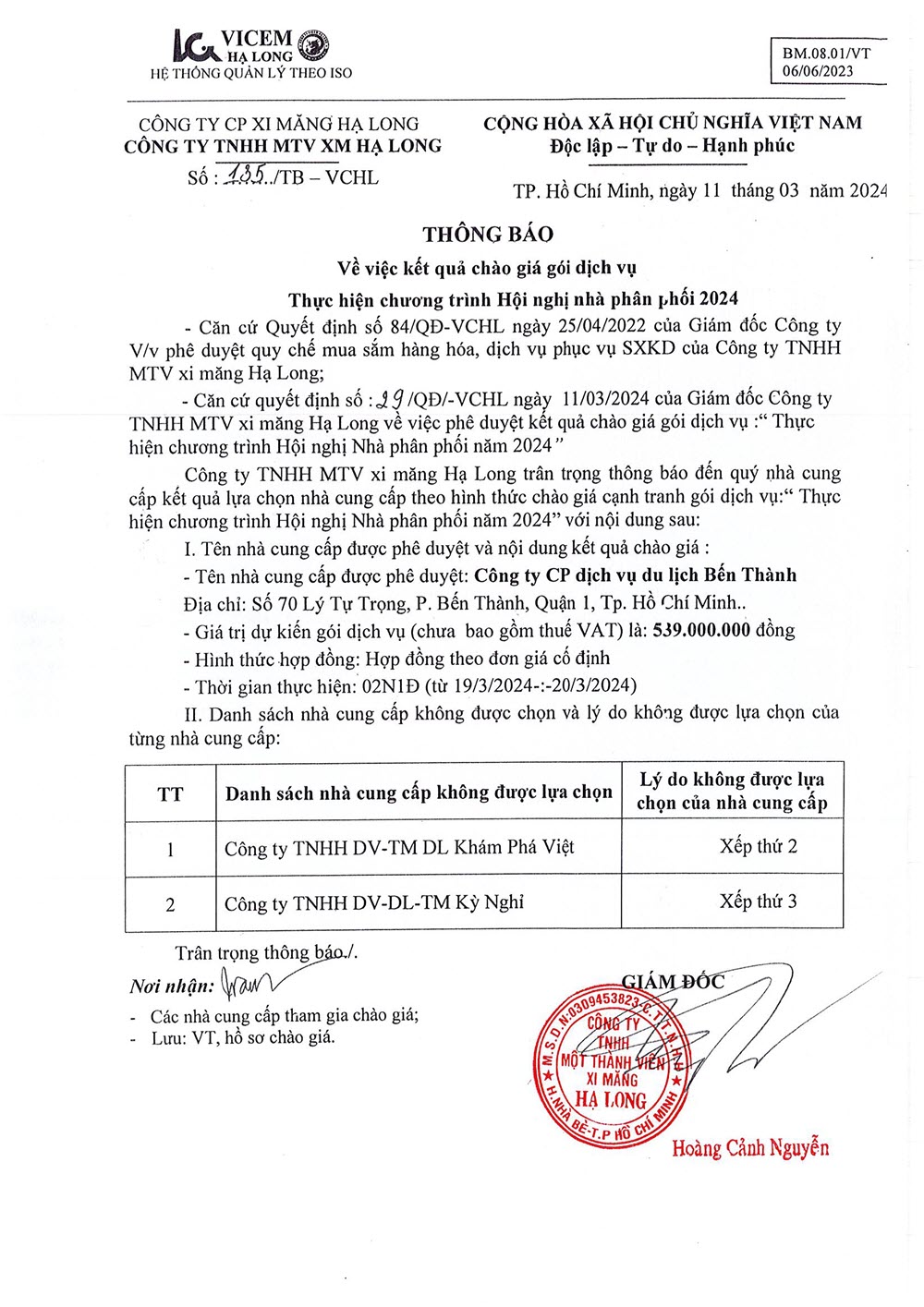 Thông báo kết quả chào giá gói dịch vụ “Thực hiện chương trình hội nghị nhà phân phối năm 2024”