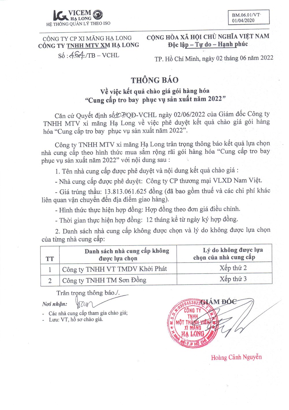 Thông báo kết quả chào giá gói hàng hóa “Cung cấp tro bay phục vụ sản xuất năm 2022”