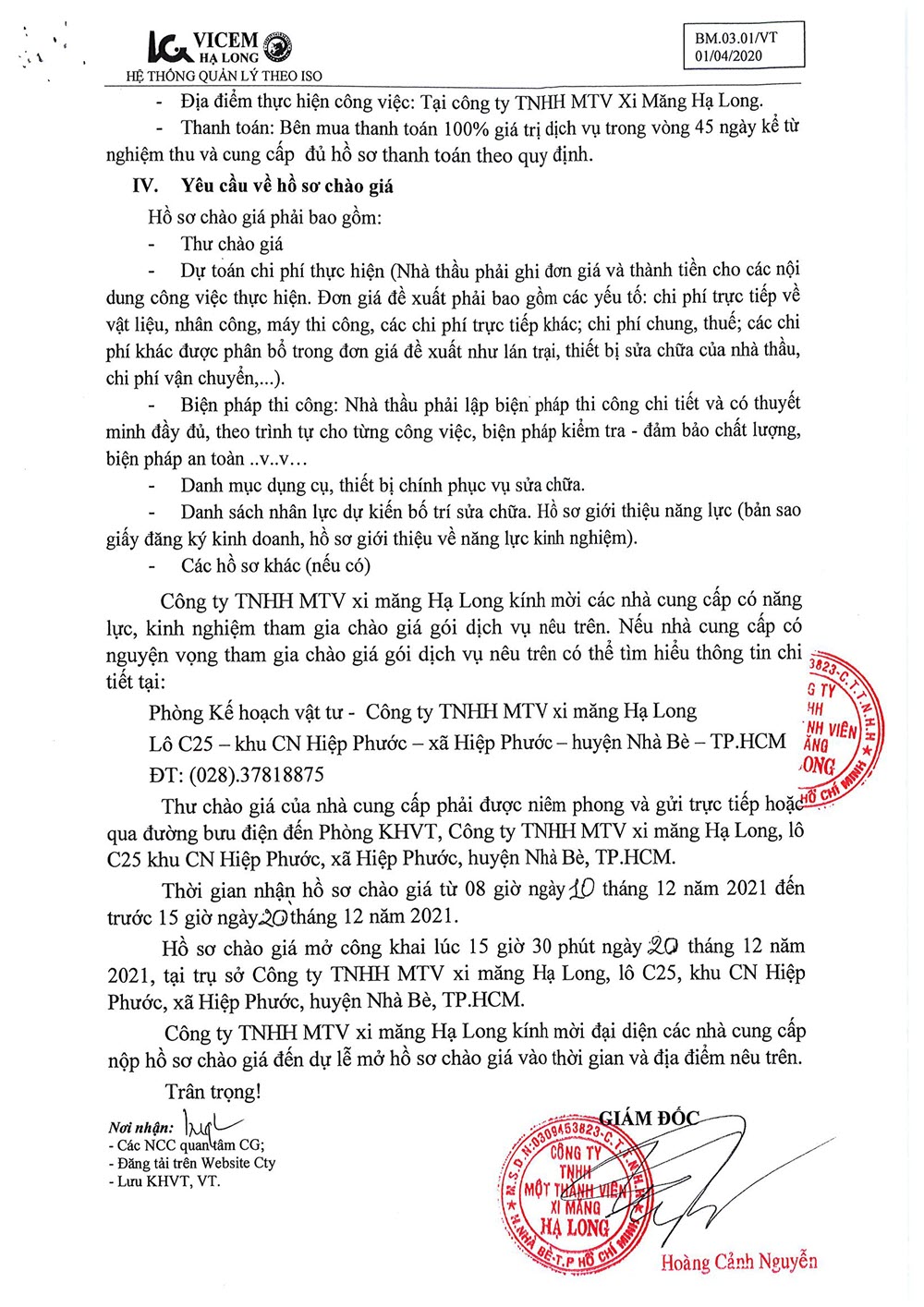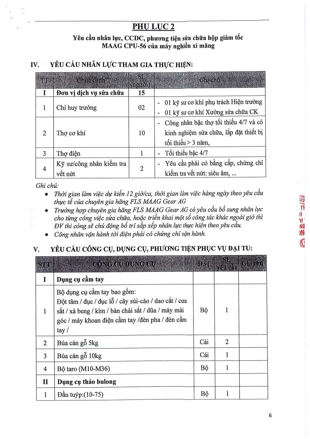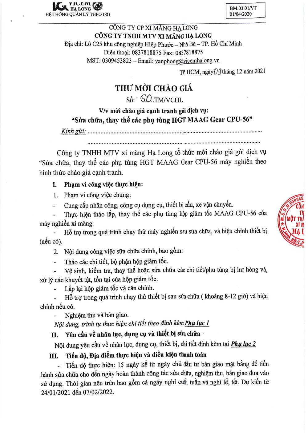 Thư mời chào giá cạnh tranh gói dịch vụ “Sửa chữa, thay thế các phụ tùng HGT MAAG GEAR CPU-56”