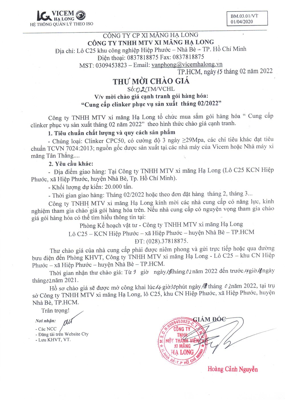 Thư mời chào giá cạnh tranh gói hàng hóa “Cung cấp Clinker phục vụ sản xuất tháng 02/2022”