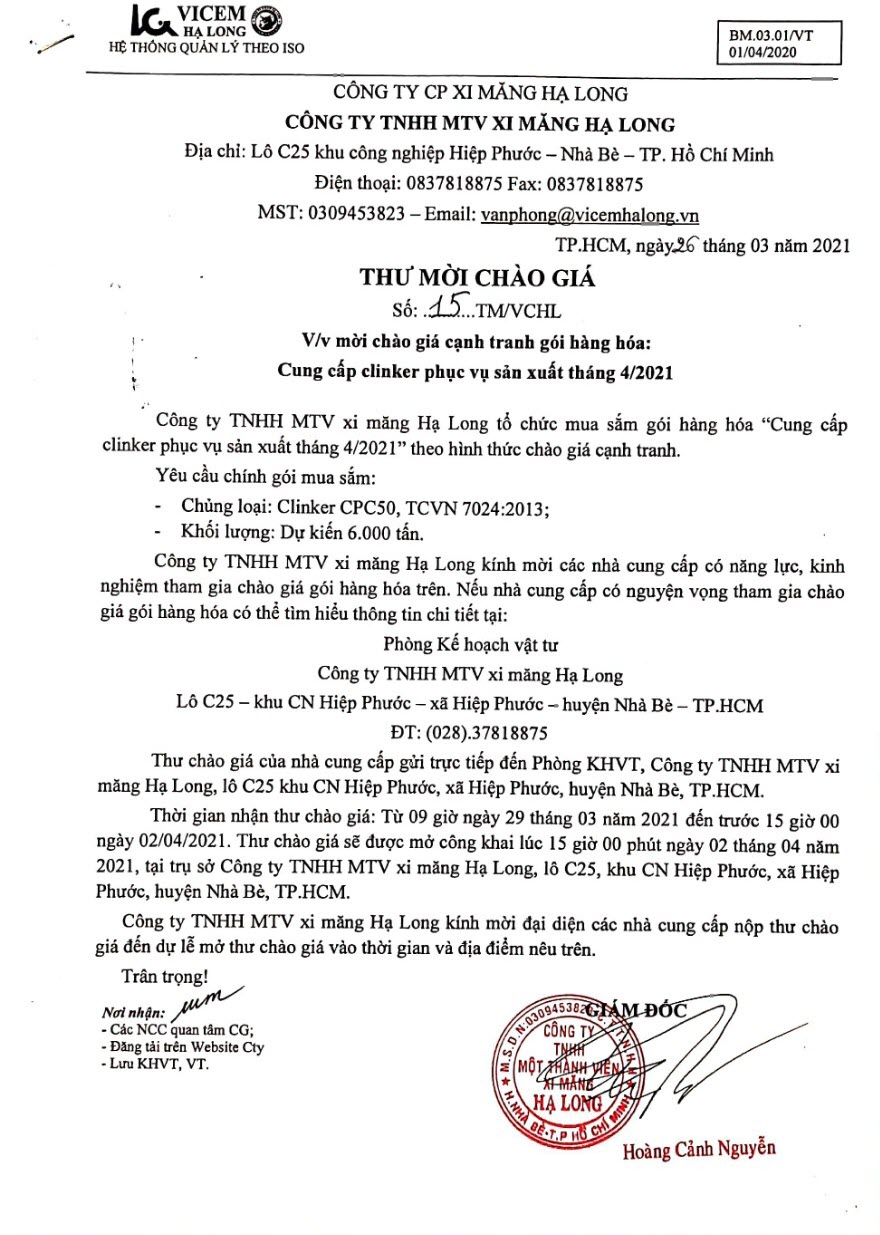 Thư mời chào giá cạnh tranh gói hàng hóa “Cung cấp clinker phục vụ sản xuất tháng 04/2021”