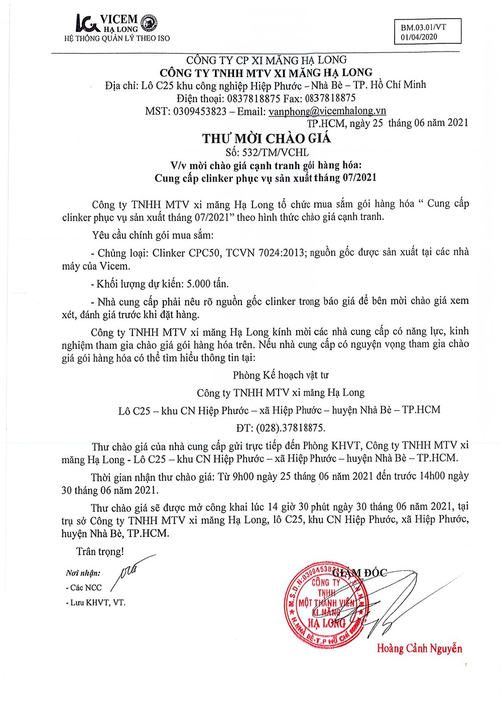 Thư mời chào giá cạnh tranh gói hàng hóa ” Cung cấp Clinker phục vụ sản xuất tháng 07/2021″”