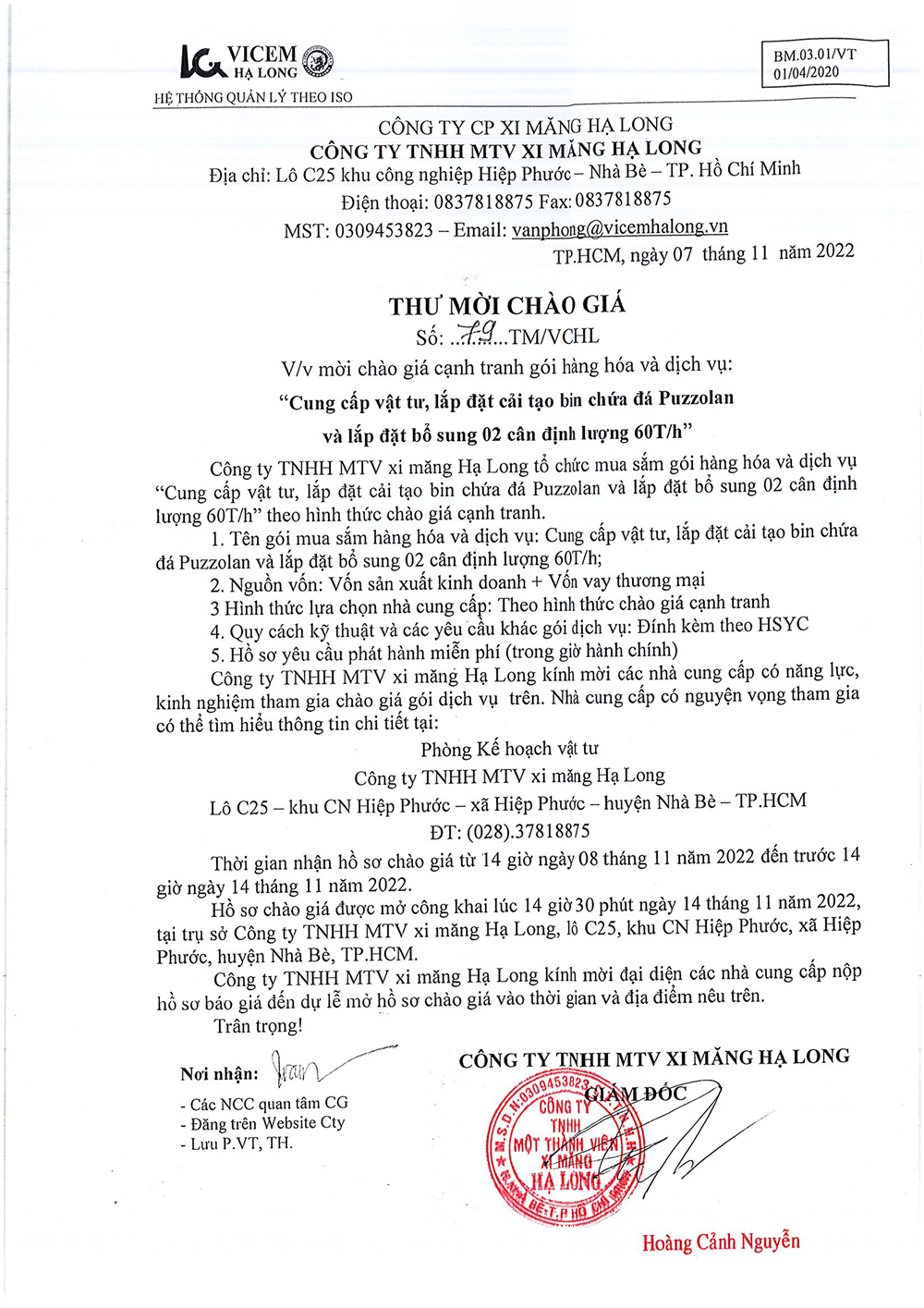 Thư mời chào giá cạnh tranh gói hàng hóa và dịch vụ ” Cung cấp vật tư, lắp đặt cải tạo bin chứa đá Puzzolan và lắp đặt bổ sung 02 cân định lượng 60 T/h”