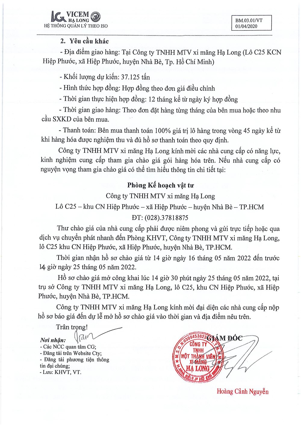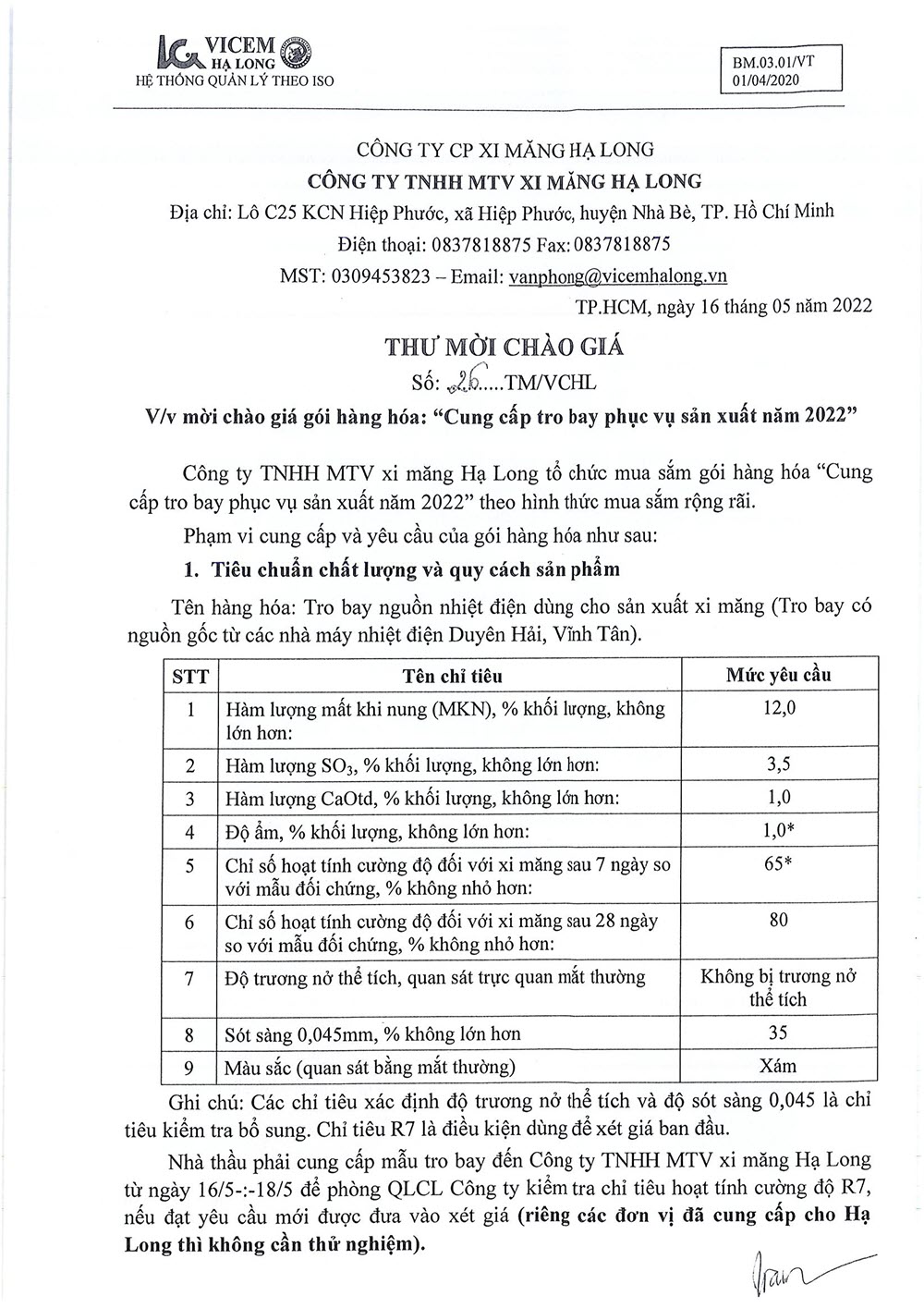 Thư mời chào giá gói hàng hóa “Cung cấp tro bay phục vụ sản xuất năm 2022”